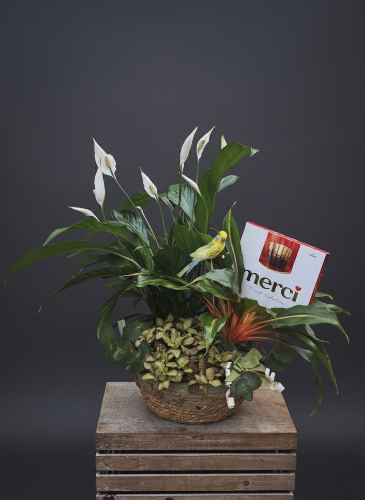 Cesta con plantas según temporada y bombones